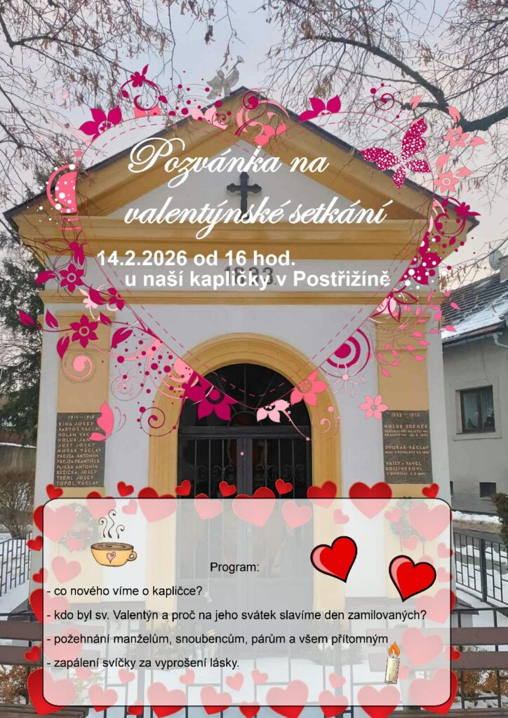 V sobotu 14. února v 16 hodin jste srdečně zváni ke kapličce v Postřižíně k valentýnskému setkání.