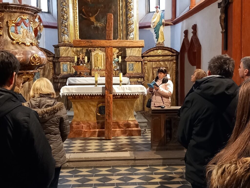 K postnímu období patří také kajícné pobožnosti křížových cest, které složí k tomu, abychom se vcítili do utrpení Ježíše Krista při jeho cestě na Golgotu a duchovně prožili jednotlivé momenty. A současně si uvědomili, že podobná trápení nevymizela, ale trvají doposud a prožívají je i mnozí naši současníci. Jak aktuálně zněla čtení z útlé brožury Křížová cesta v čase války, kterou vydal P. Petr Beneš před čtyřmi lety, když ruská armáda přepadla Ukrajinu! Jednotlivá zastavení z této knihy jsme se modlili na 1. postní neděli v kostele sv. Vavřince ve Veliké Vsi. O oltářní menzu byl opřen dřevěný kříž v životní velikosti, symbol Kristova umučení.